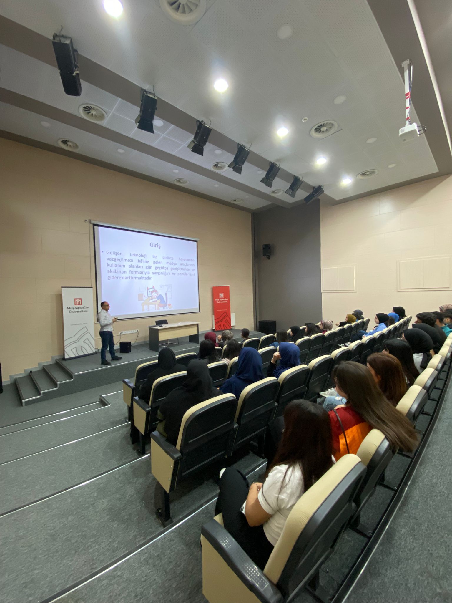 Teknolojinin günlük yaşam üzerindeki etkileri ve ekran kullanımının bireylerin psikososyal yaşamına yansımalarının ele alındığı seminerde, özellikle gençler arasında artış gösteren çoklu ekran bağımlılığına dikkat çekildi. Öğrencilere, dijital ekranların yoğun kullanımının odaklanma, uyku düzeni ve sosyal ilişkiler üzerindeki olumsuz etkileri hakkında bilgiler verildi.